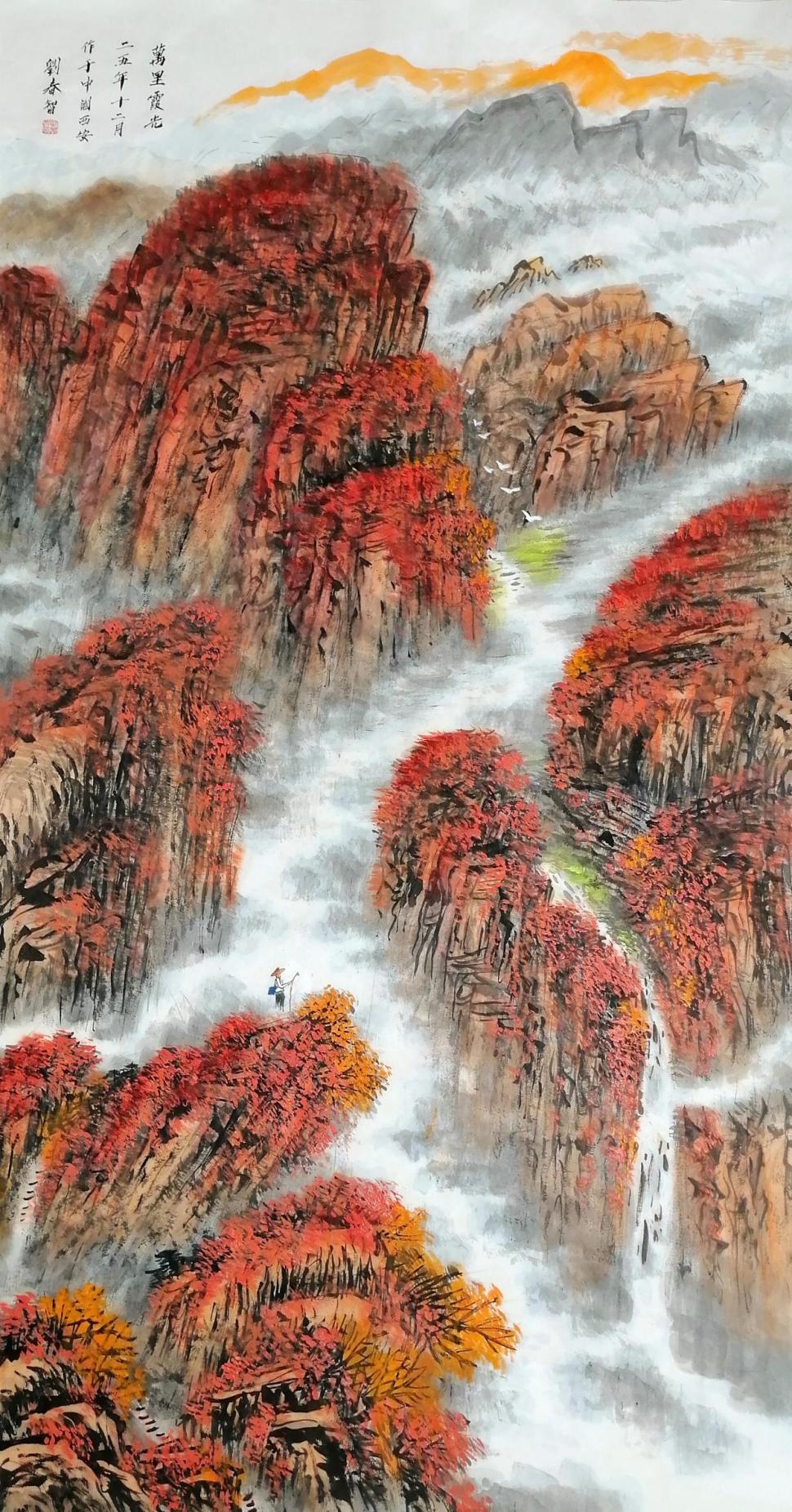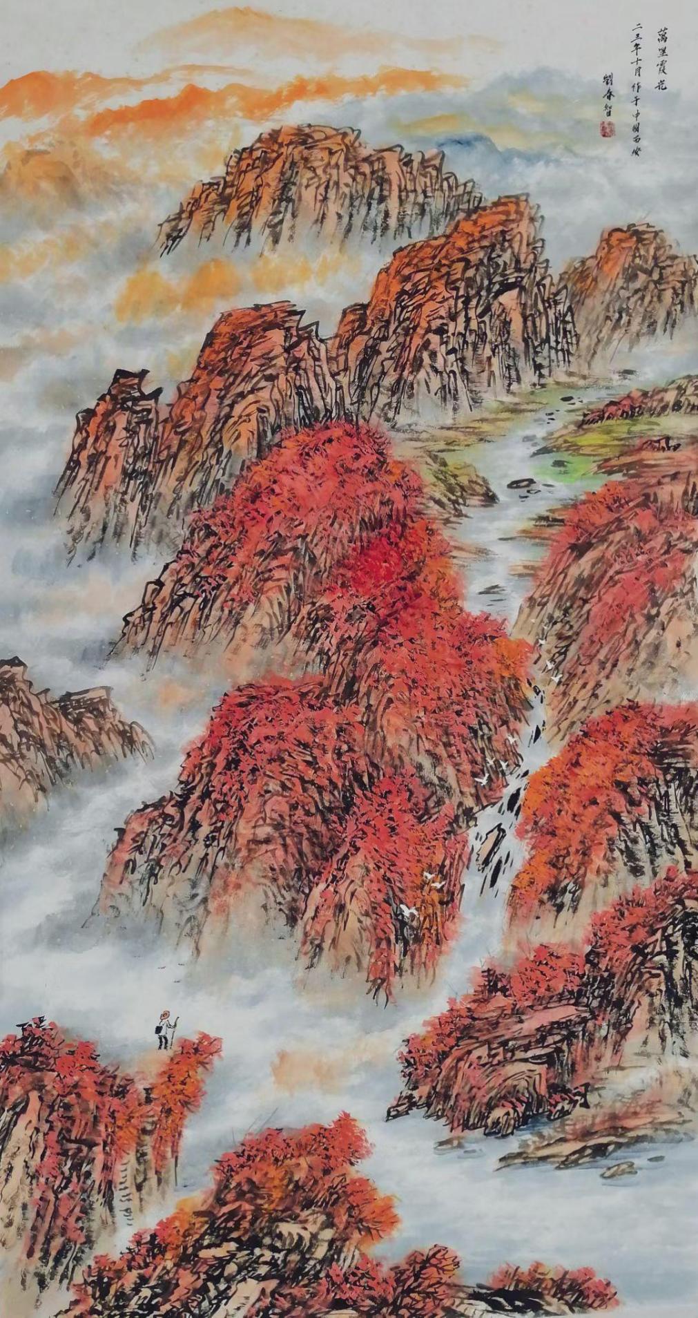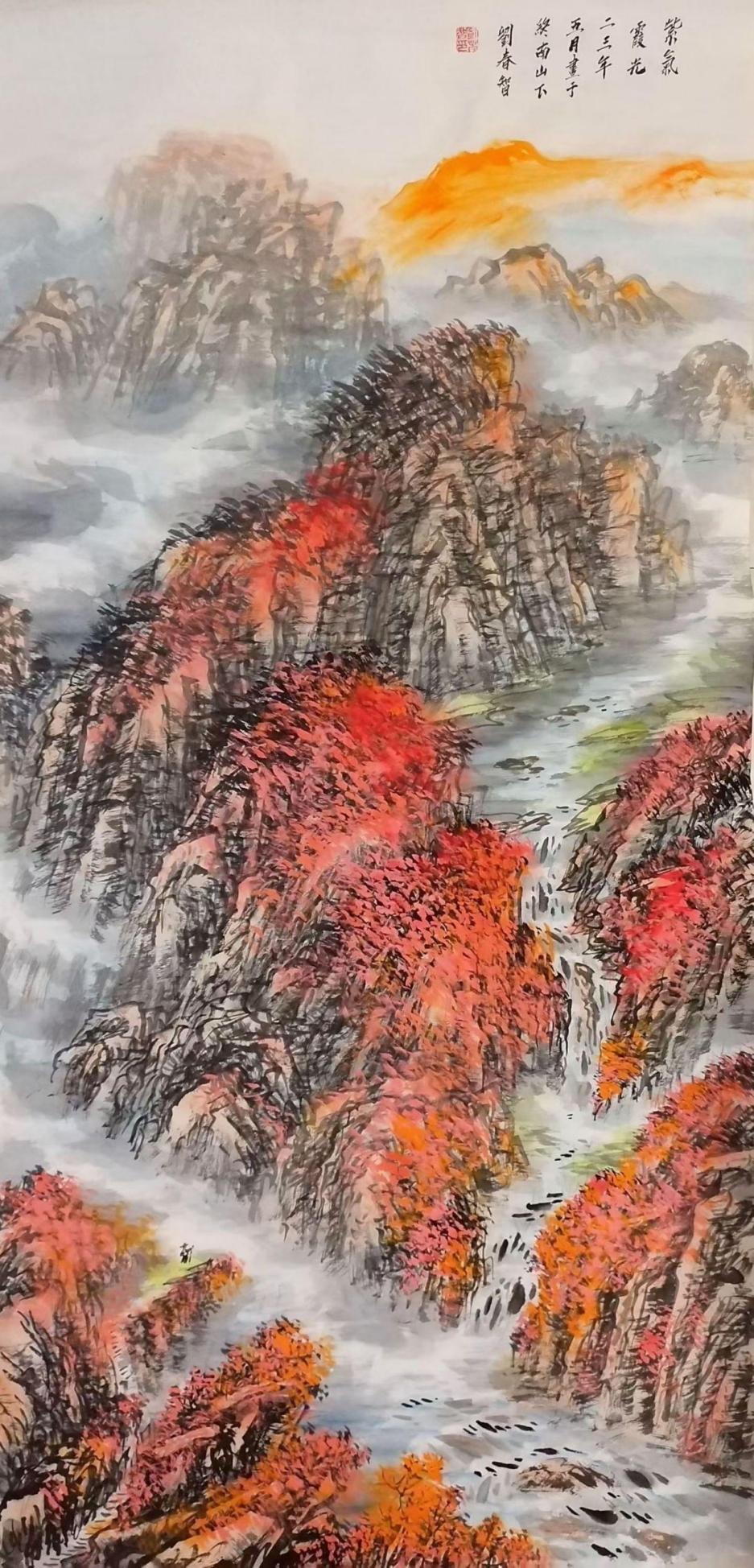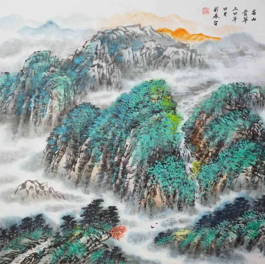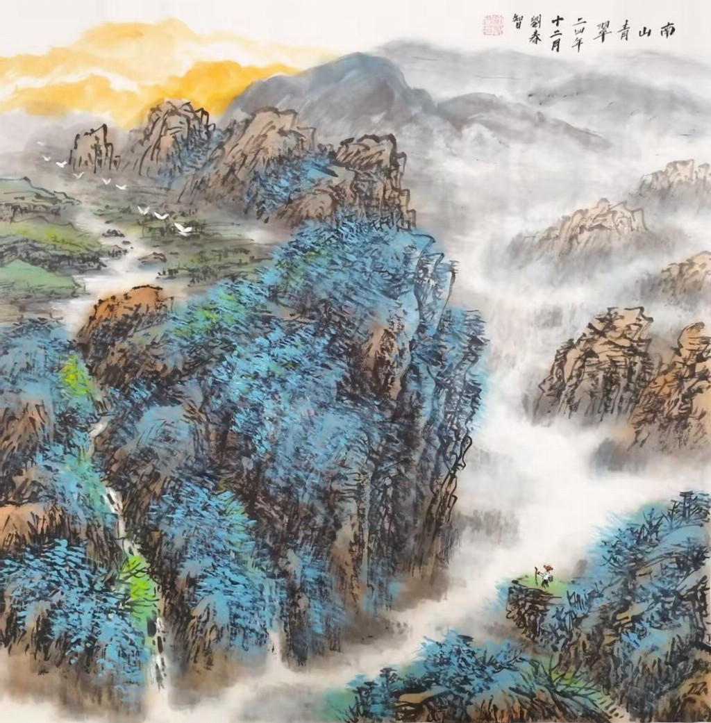 在艺术创作与社会影响方面,刘春智的山水画以秦岭等地域文化为题材,2023年12月,作品《大秦岭》悬挂于政协陕西省西安市委员会办公厅,2024年3月,《南五台霞光》悬挂于陕西省西安市长安区人民政府大楼,通过斧劈皴、雨点皴等传统技法结合青绿或深绛设色与矿物颜料,既传承了北派山水的雄浑气韵,又融入现代审美,体现了“守正创新”的创作理念。还有多幅作品被政府单位、中国国家博物馆收藏,并作为定制画服务于多地政务空间,成为展现文化自信的载体。