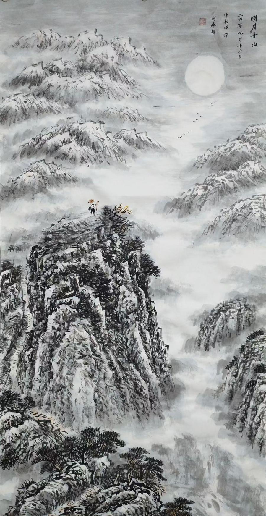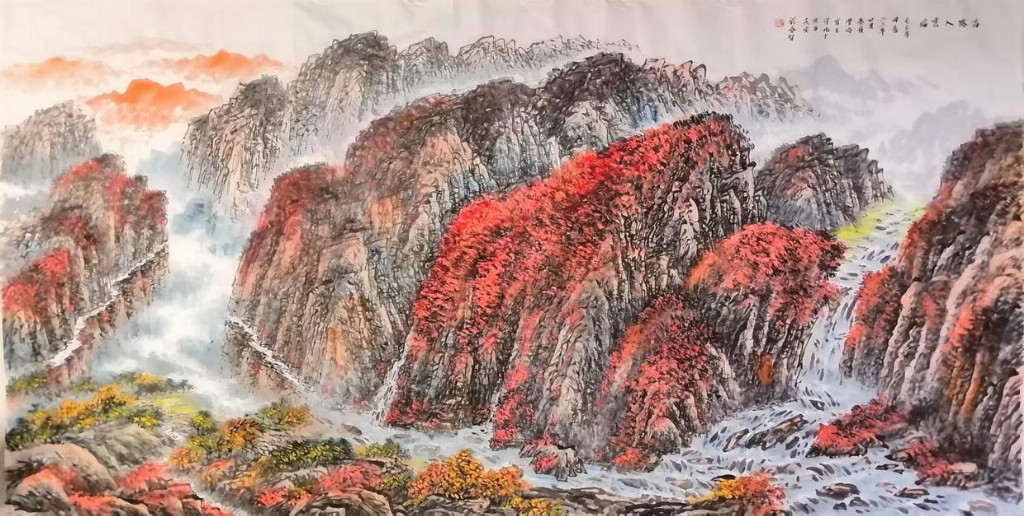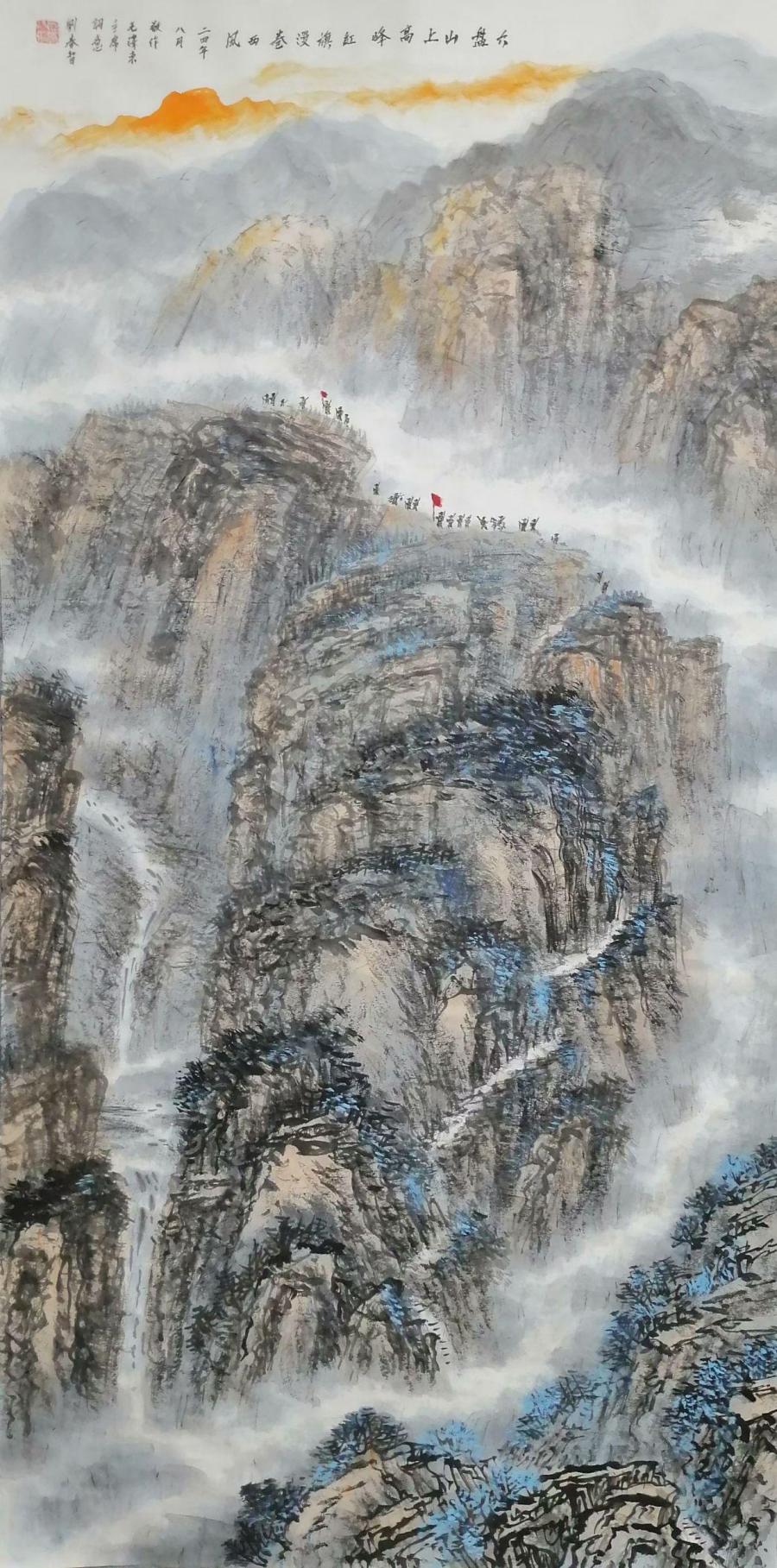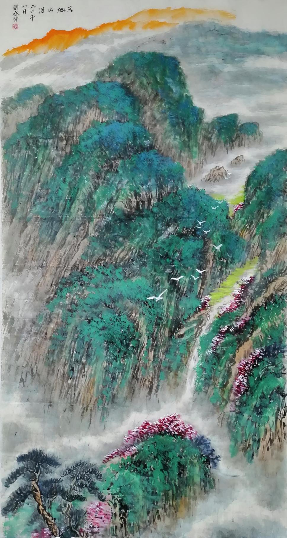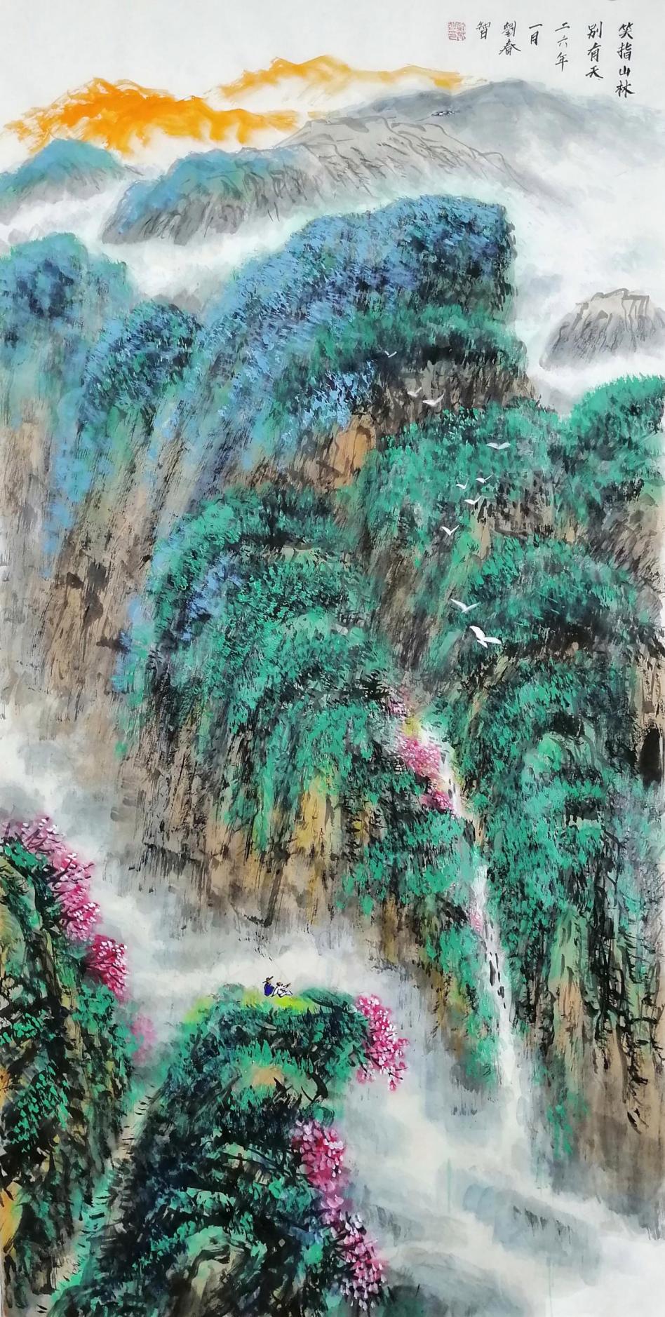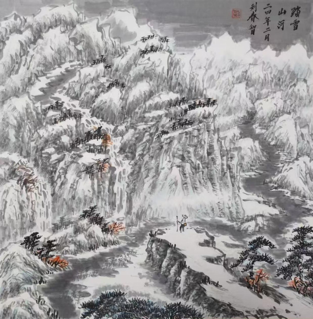 在艺术创作与社会影响方面,刘春智的山水画以秦岭等地域文化为题材,2023年12月,作品《大秦岭》悬挂于政协陕西省西安市委员会办公厅,2024年3月,《南五台霞光》悬挂于陕西省西安市长安区人民政府大楼,通过斧劈皴、雨点皴等传统技法结合青绿或深绛设色与矿物颜料,既传承了北派山水的雄浑气韵,又融入现代审美,体现了“守正创新”的创作理念。还有多幅作品被政府单位、中国国家博物馆收藏,并作为定制画服务于多地政务空间,成为展现文化自信的载体。