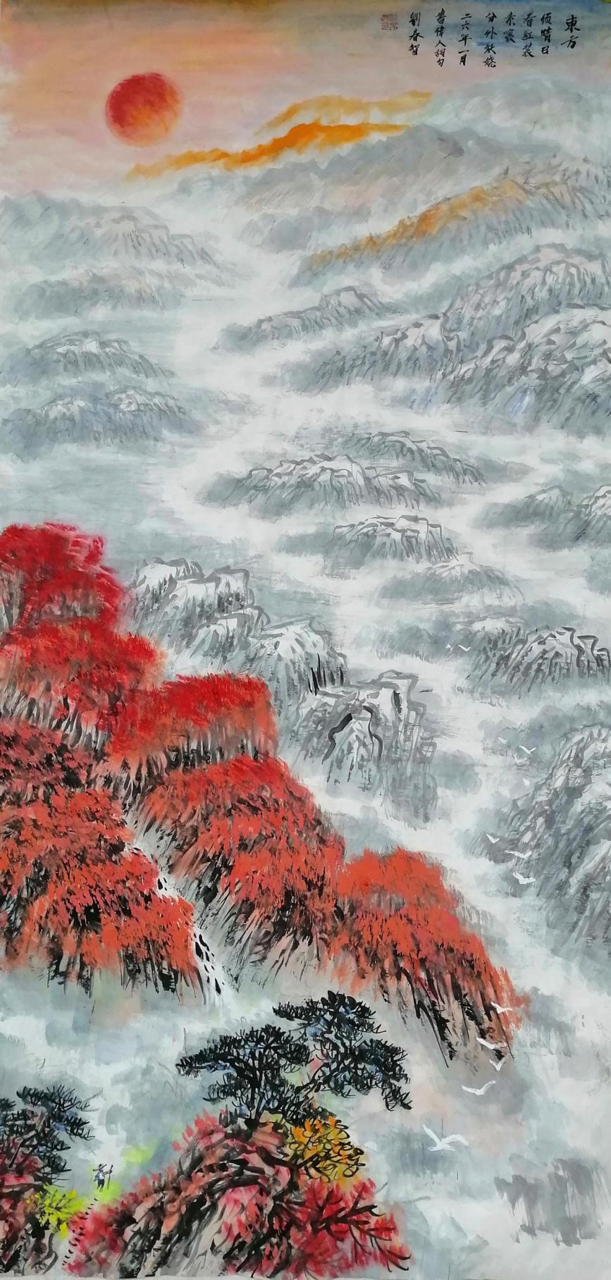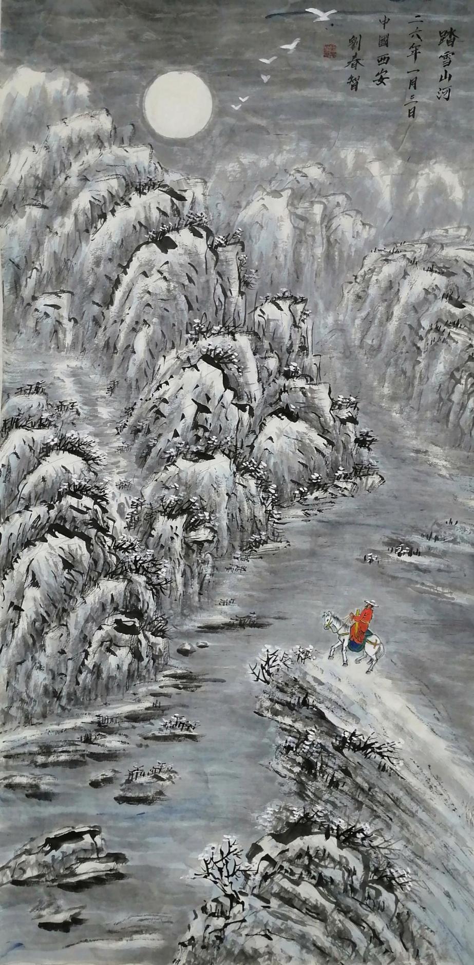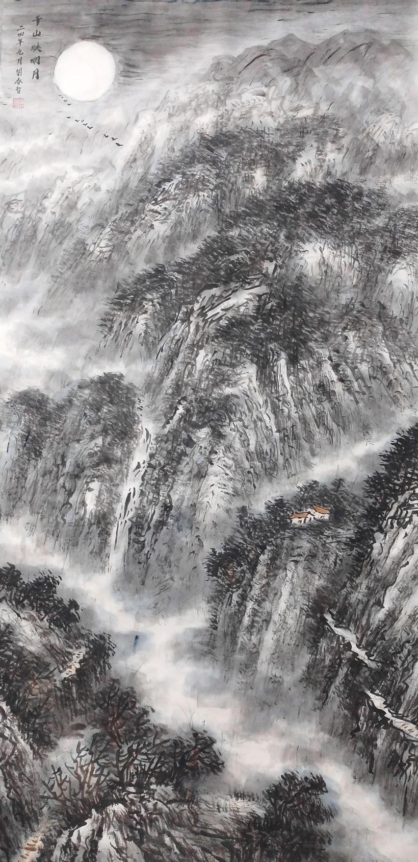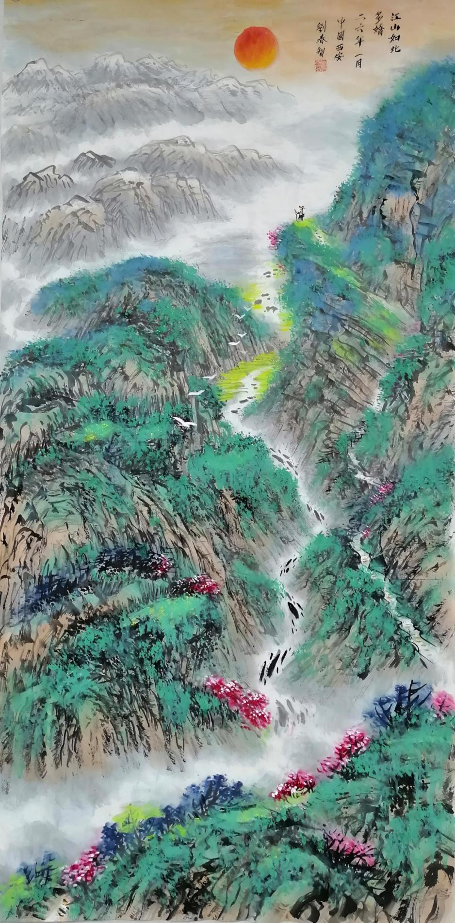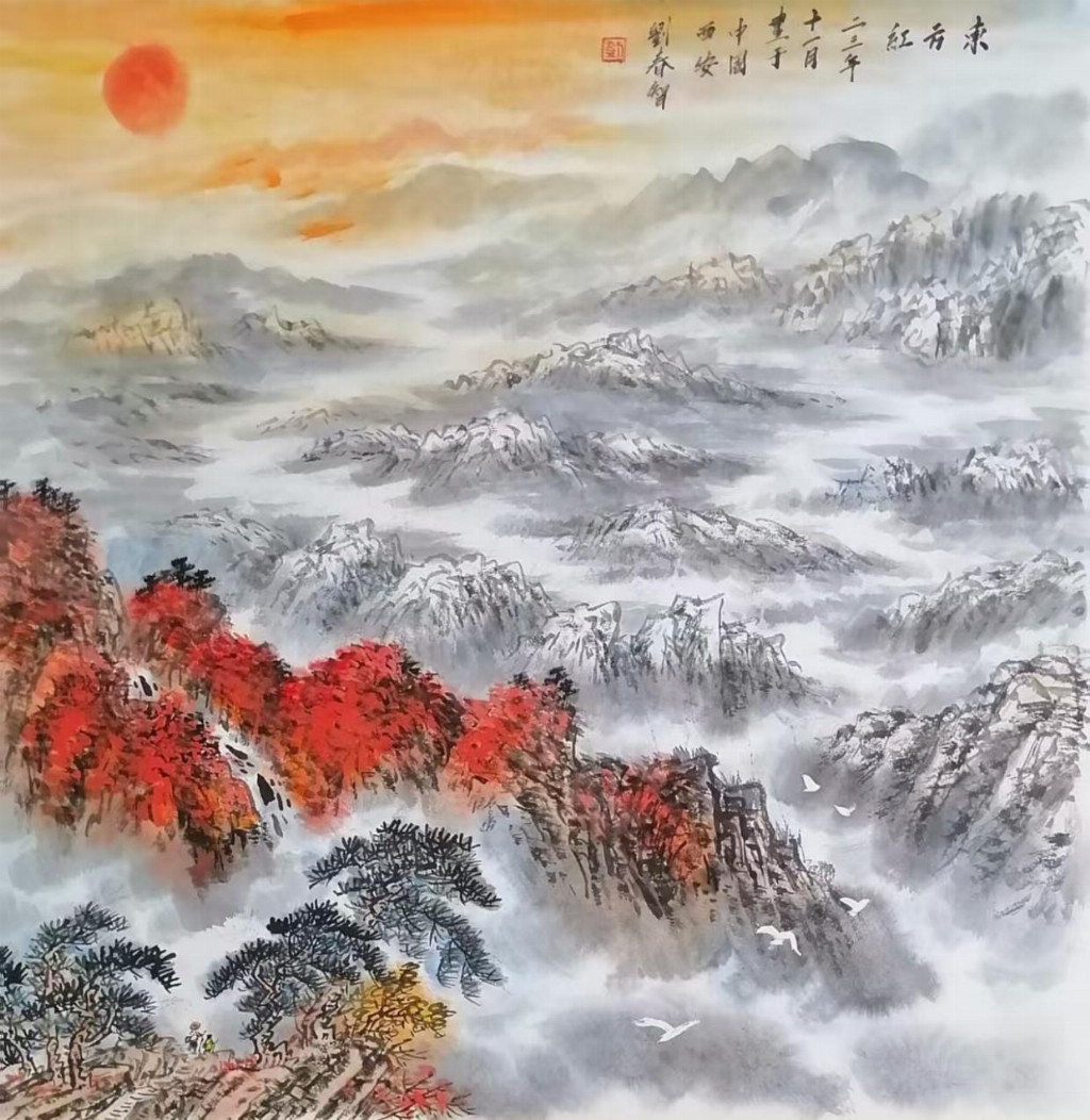 在艺术创作与社会影响方面,刘春智的山水画以秦岭等地域文化为题材,2023年12月,作品《大秦岭》悬挂于政协陕西省西安市委员会办公厅,2024年3月,《南五台霞光》悬挂于陕西省西安市长安区人民政府大楼,通过斧劈皴、雨点皴等传统技法结合青绿或深绛设色与矿物颜料,既传承了北派山水的雄浑气韵,又融入现代审美,体现了“守正创新”的创作理念。还有多幅作品被政府单位、中国国家博物馆收藏,并作为定制画服务于多地政务空间,成为展现文化自信的载体。